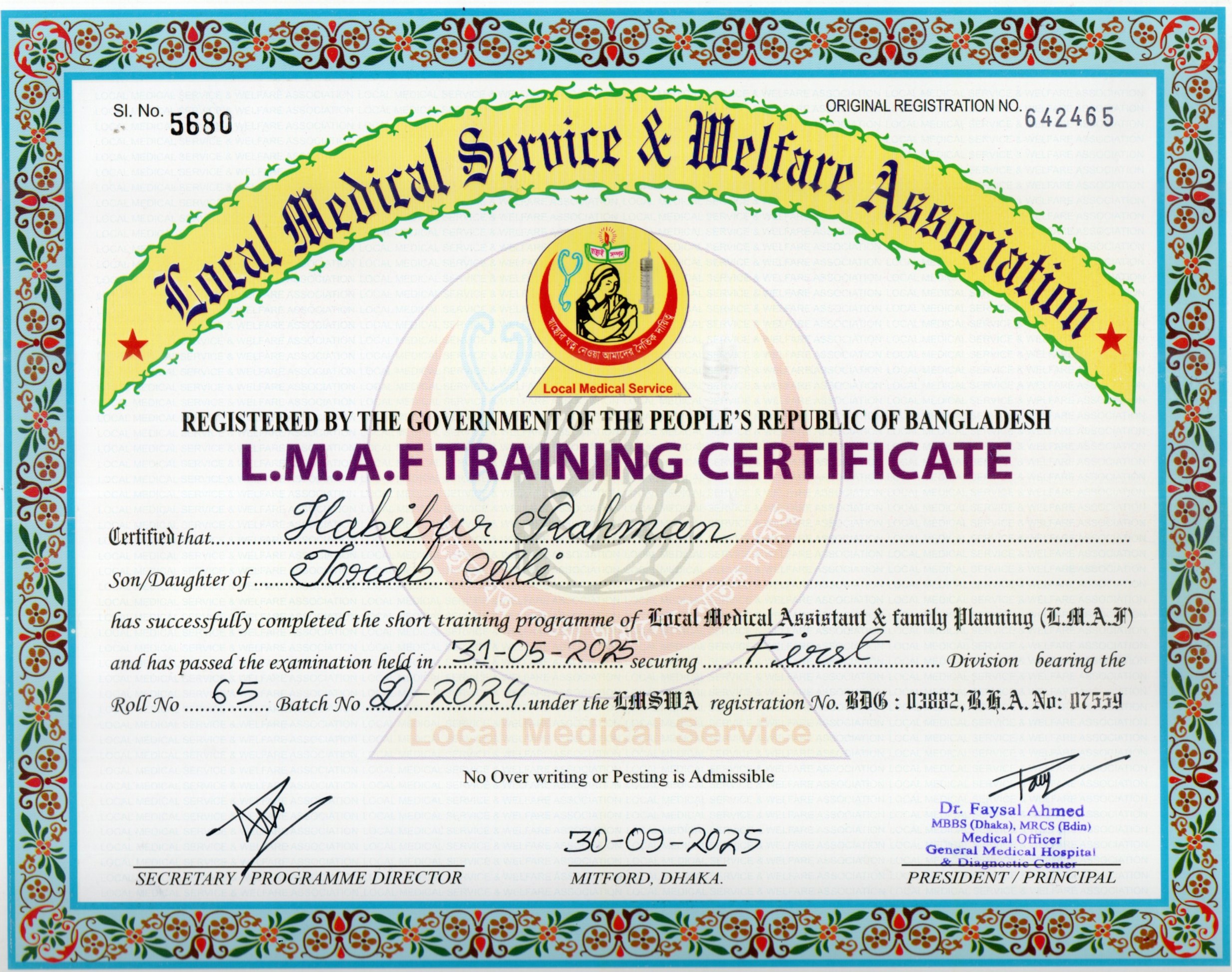 | Mother's Name | Monoara Begum | Institute | LOCAL MEDICAL SERVICE |