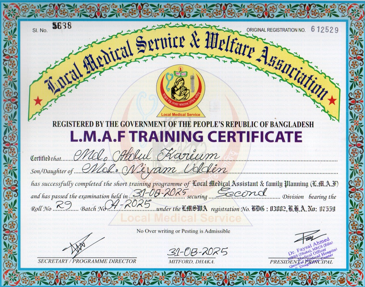 | Mother's Name | SAHNAG BEGUM | Institute | LOCAL MEDICAL SERVICE |