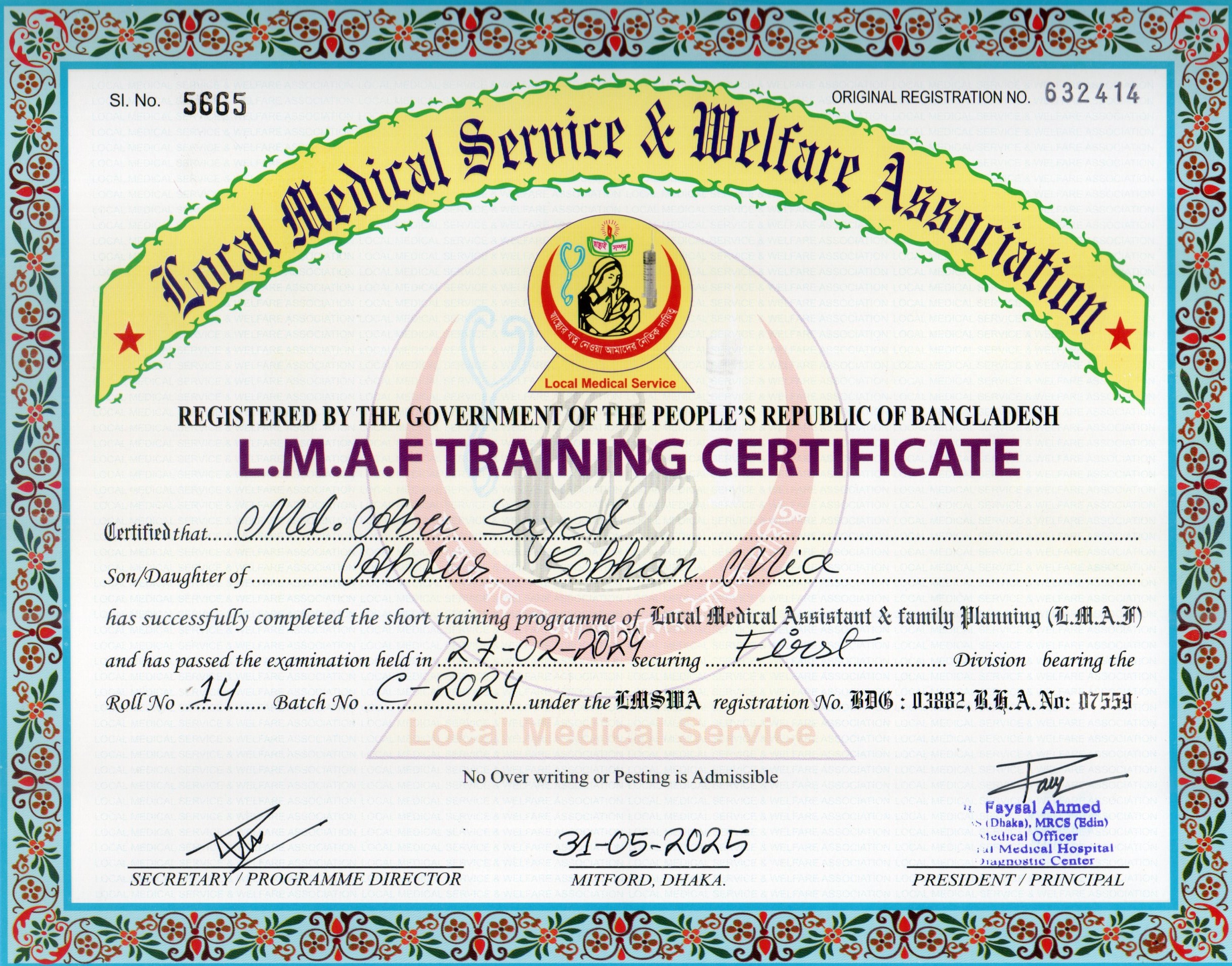 | Mother's Name | Sobura Begum | Institute | LOCAL MEDICAL SERVICE |