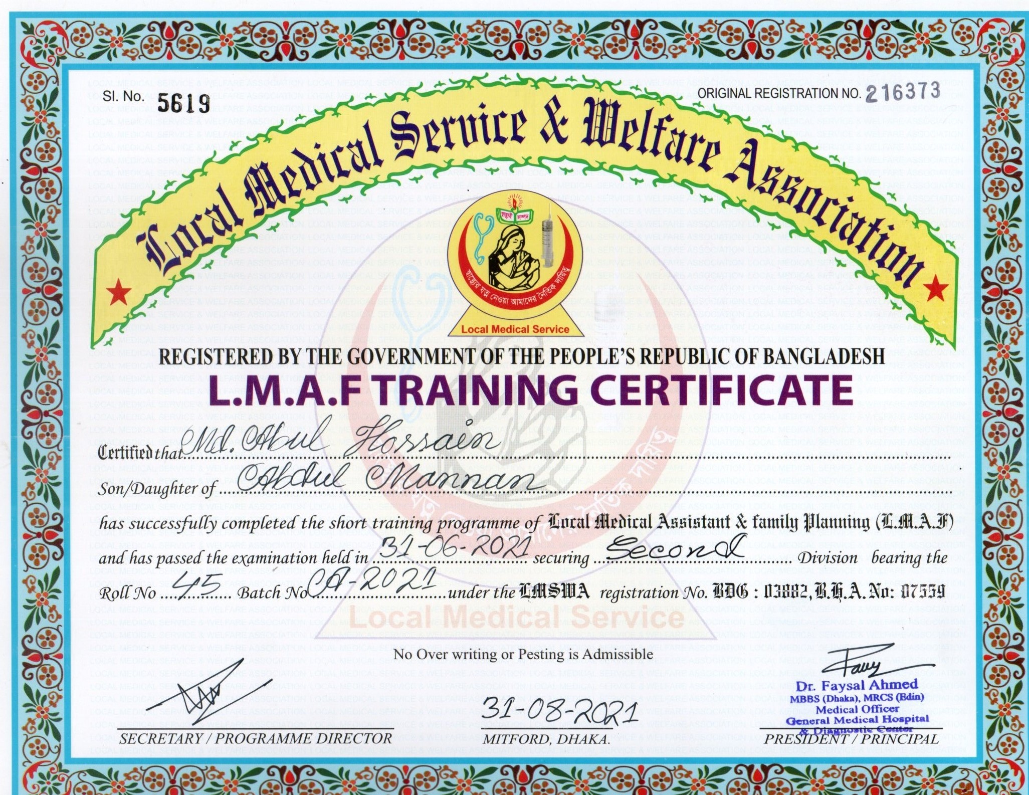 | Mother's Name | Mst Feroza Begum | Institute | LOCAL MEDICAL SERVICE |