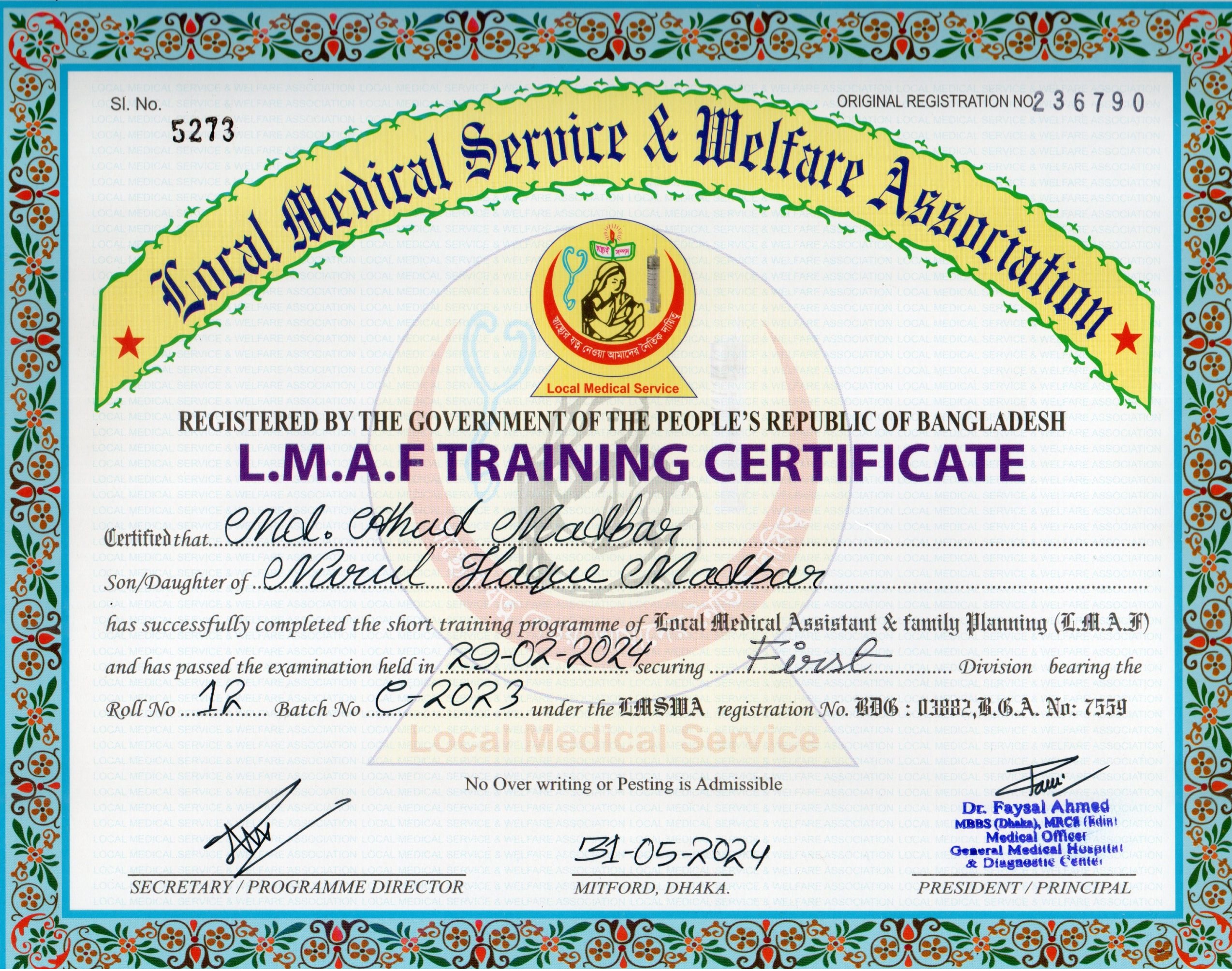| Mother's Name | Shahida Begum | Institute | LOCAL MEDICAL SERVICE |