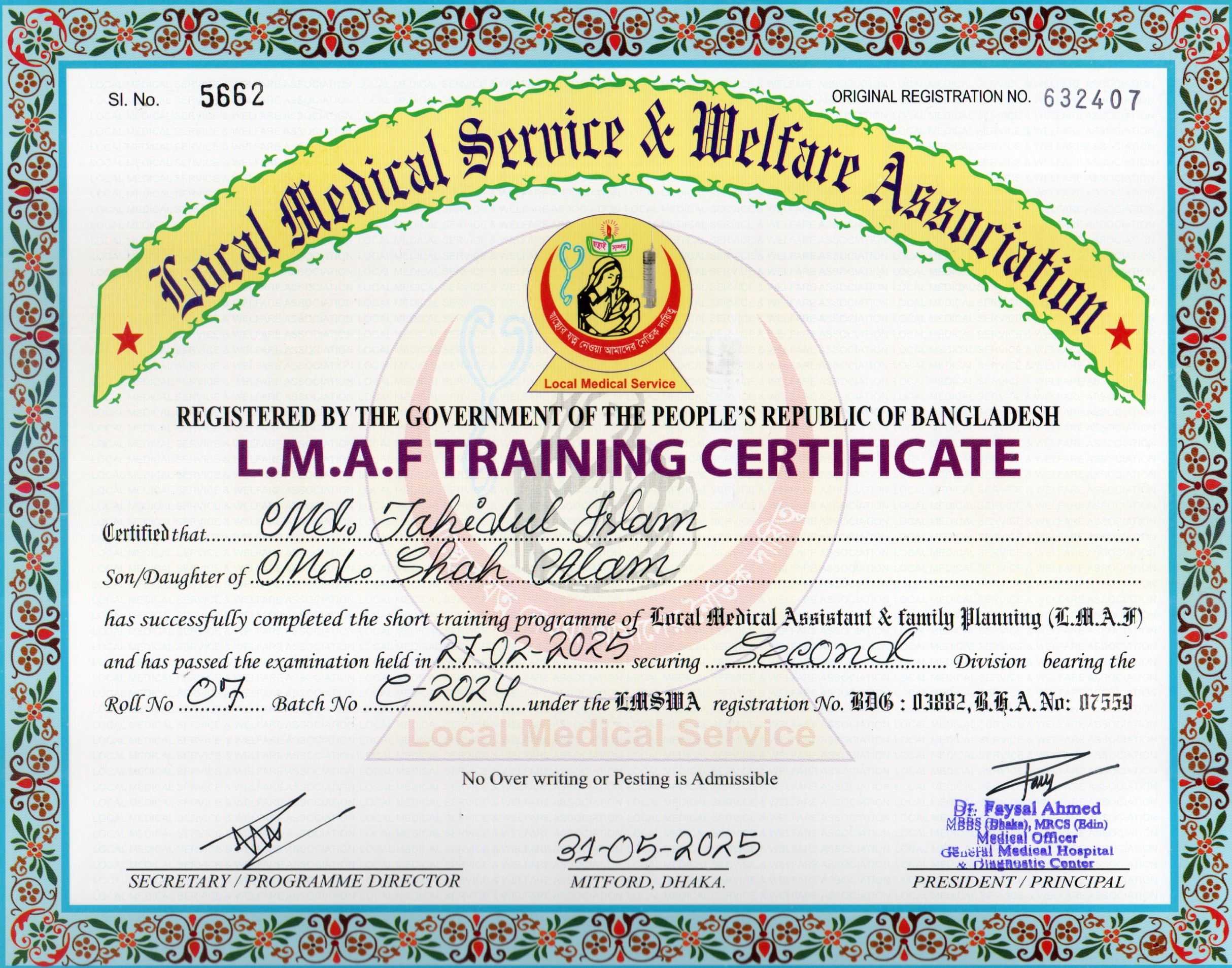 | Mother's Name | Minara Begum | Institute | LOCAL MEDICAL SERVICE |