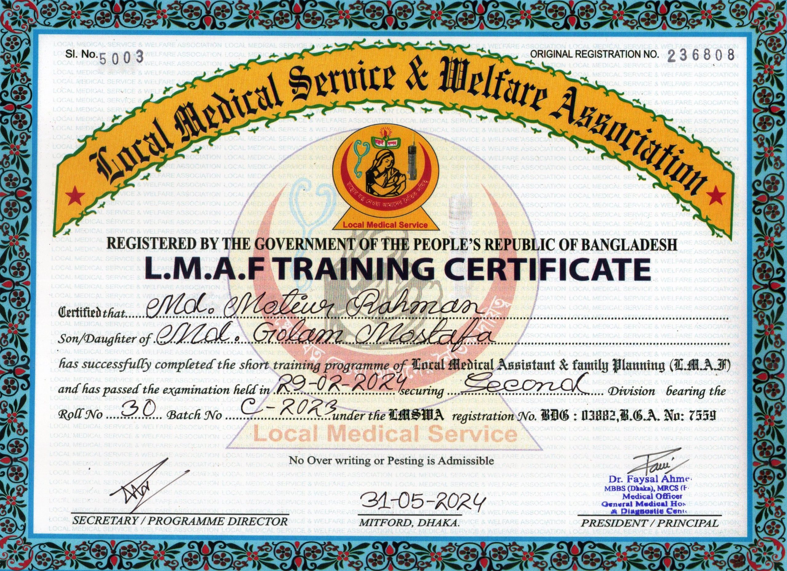 | Mother's Name | Layla Begum | Institute | LOCAL MEDICAL SERVICE |