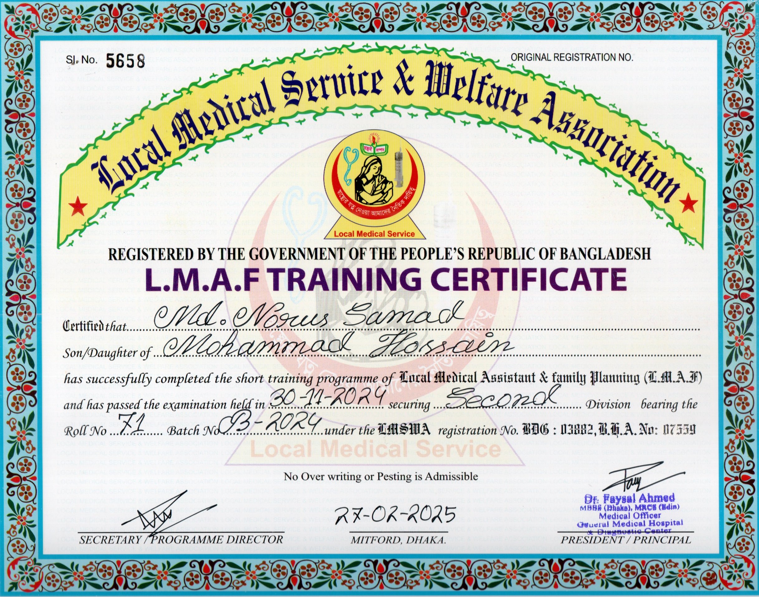 | Mother's Name | Noor Jahan Begum | Institute | LOCAL MEDICAL SERVICE |