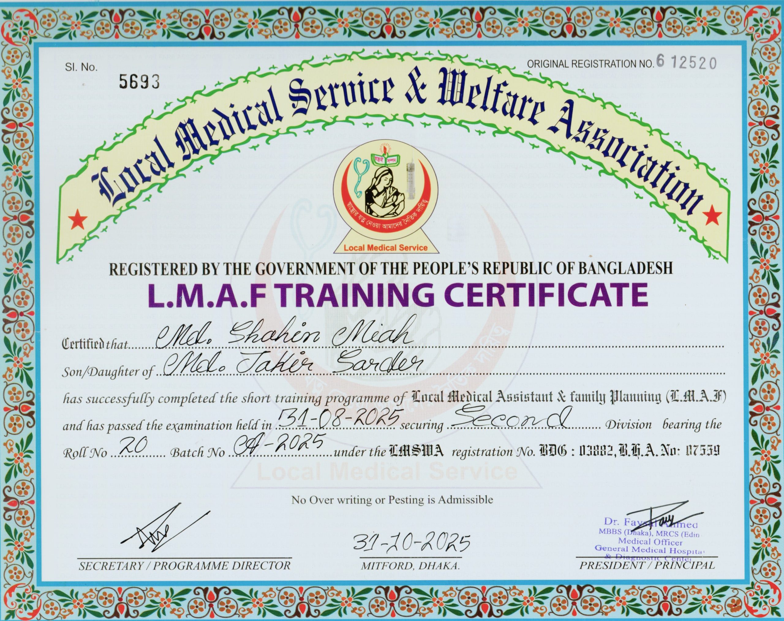 | Mother's Name | KHALEDA BEGUM | Institute | LOCAL MEDICAL SERVICE |