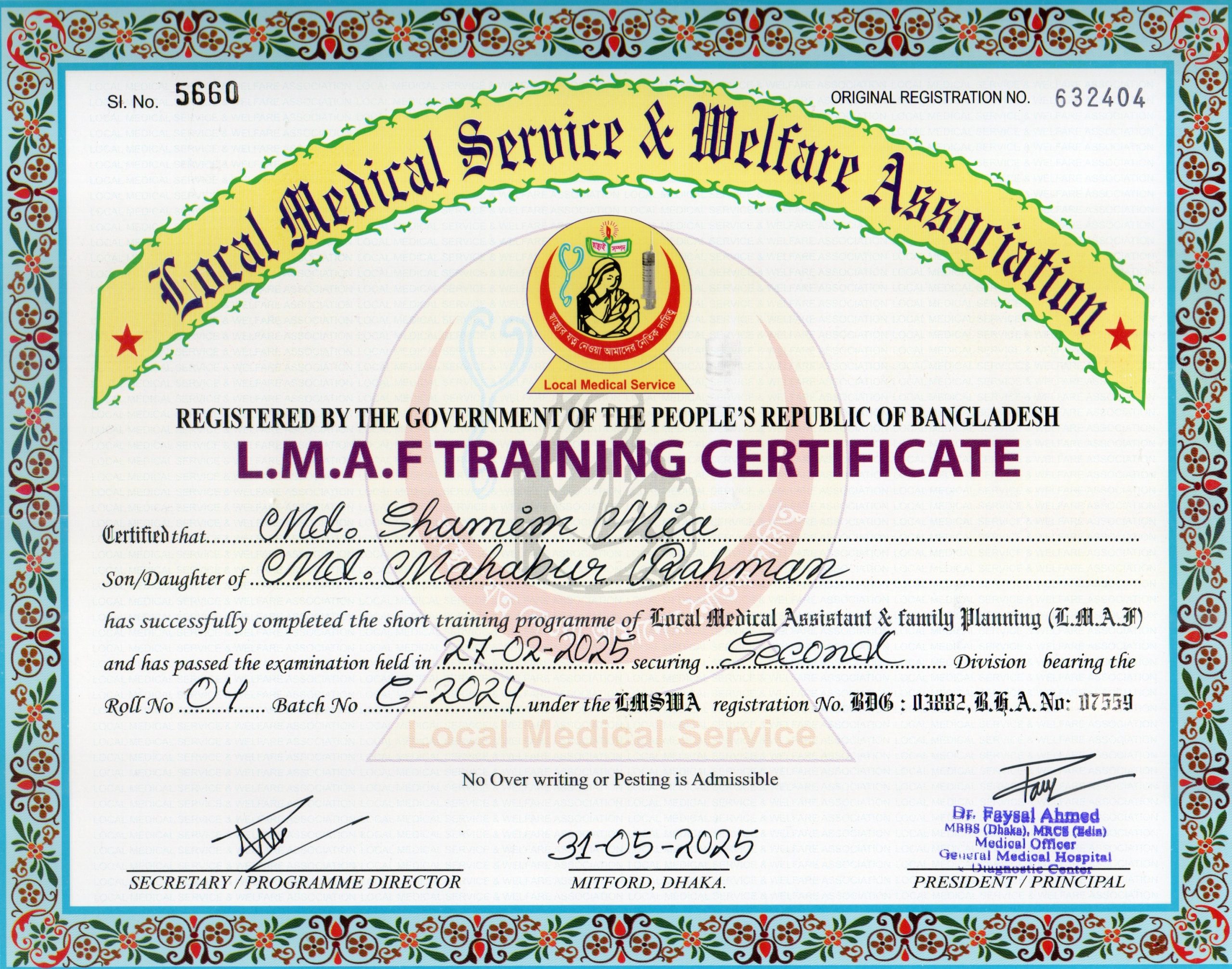 | Mother's Name | Mst Saleha Begum | Institute | LOCAL MEDICAL SERVICE |