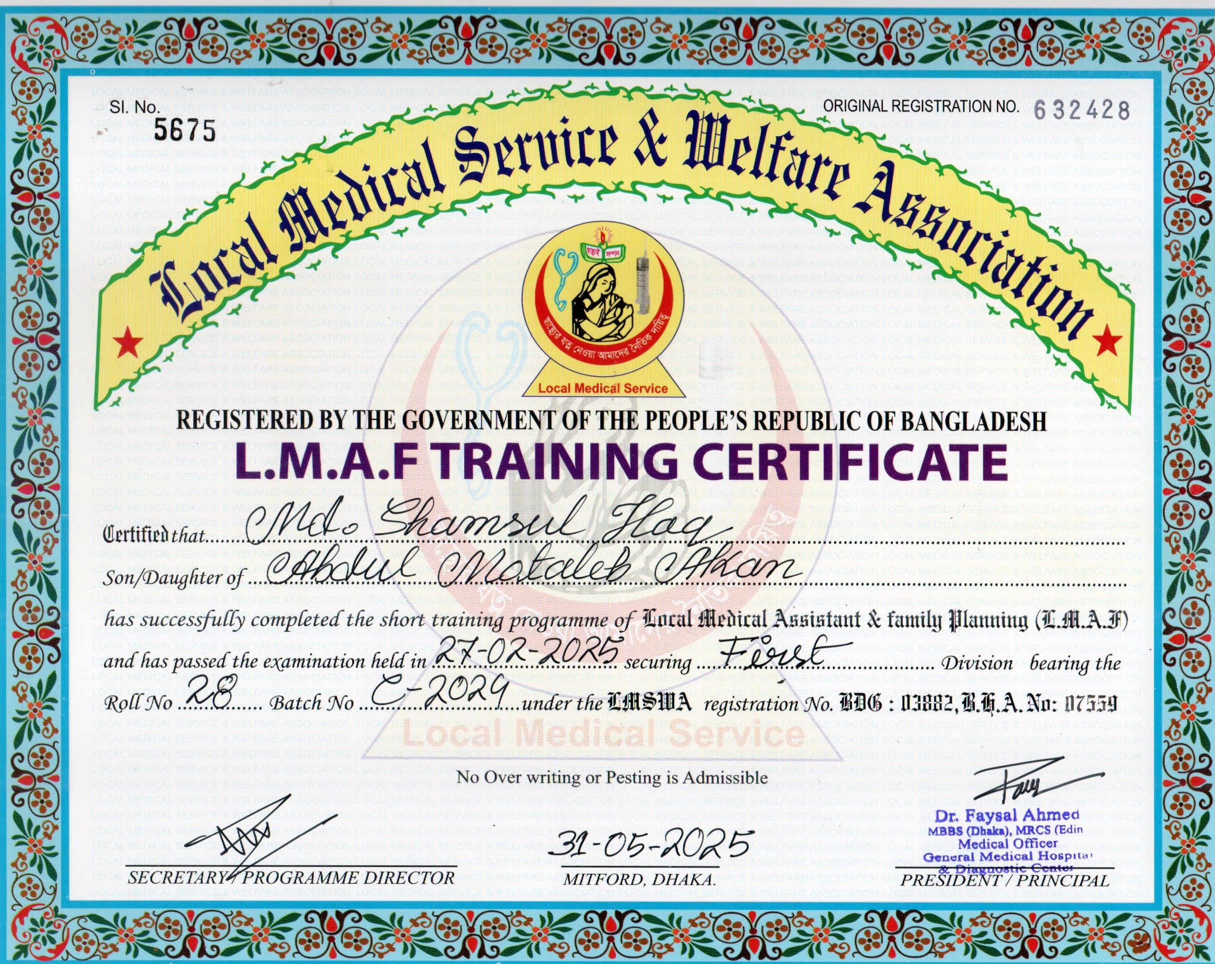 | Mother's Name | Syeda Begum | Institute | LOCAL MEDICAL SERVICE |
