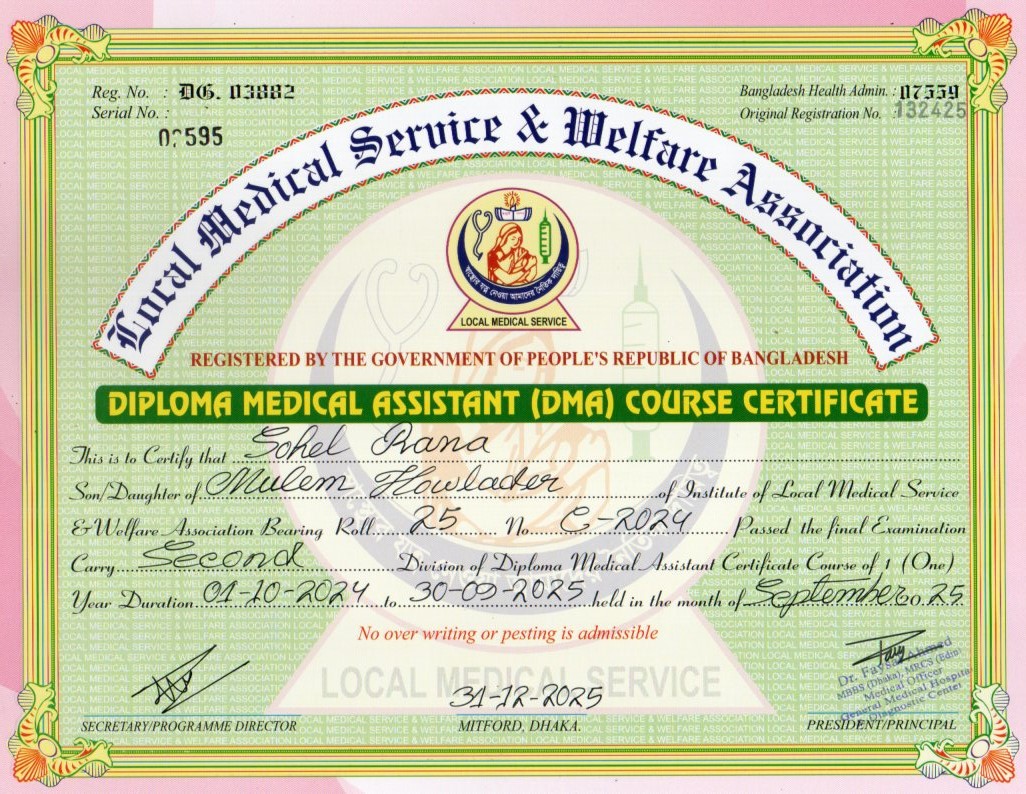 | Mother's Name | Nasima Begum | Institute | LOCAL MEDICAL SERVICE |