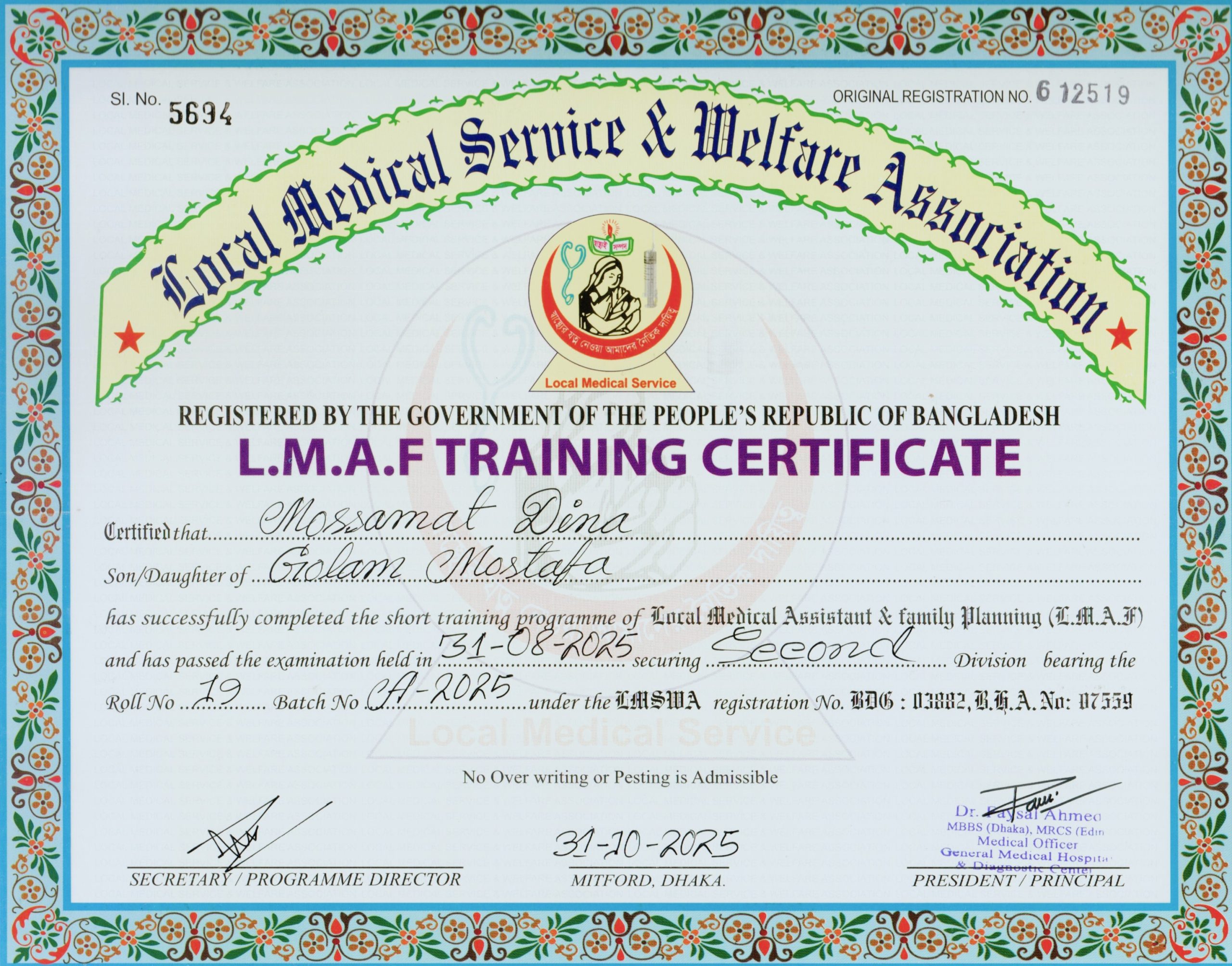 Mother's Name SAFIA BEGUM Institute LOCAL MEDICAL SERVICE