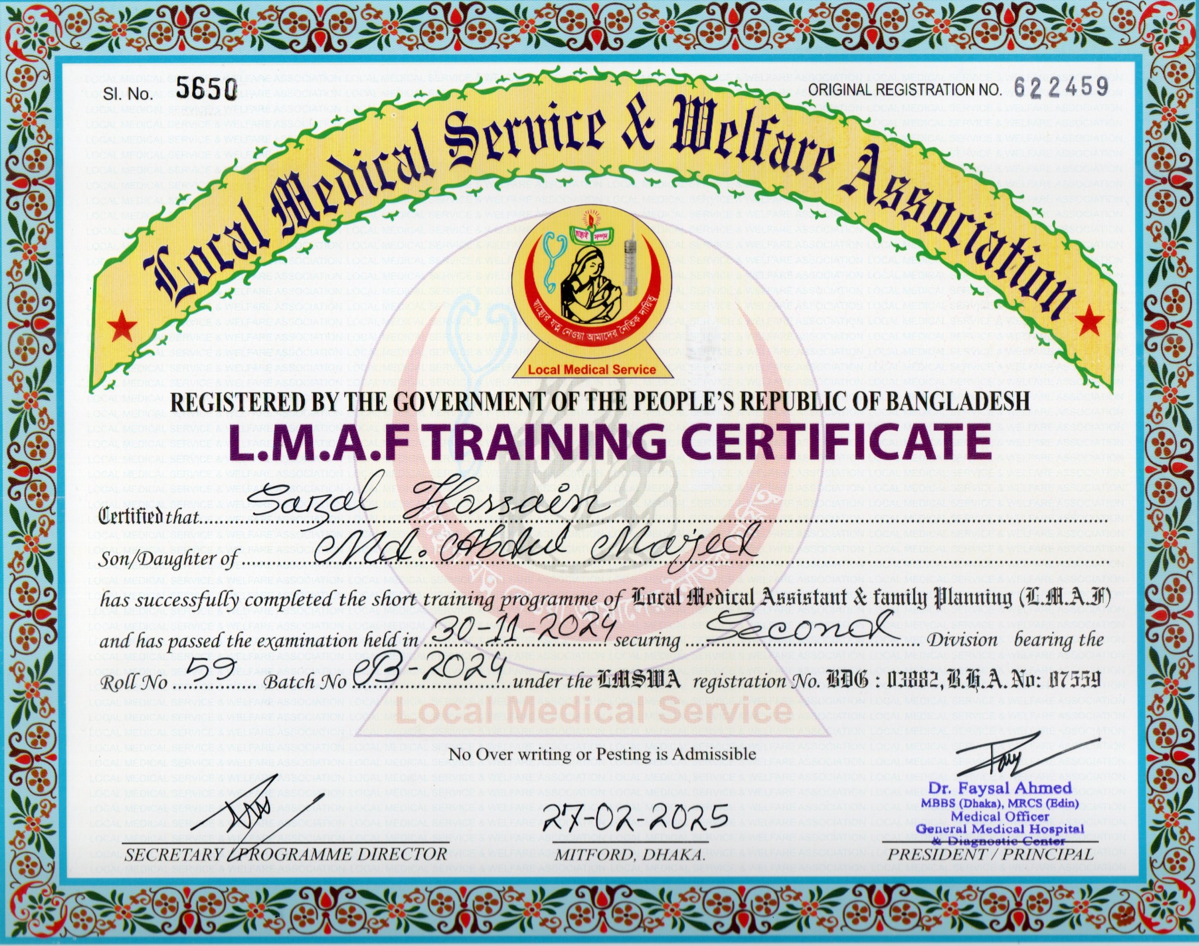 | Mother's Name | Rahima Begum | Institute | LOCAL MEDICAL SERVICE |